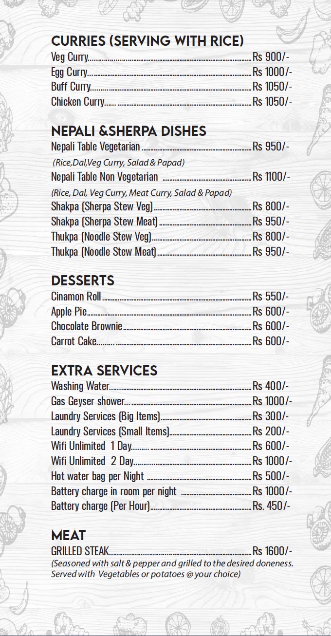 Our restaurant serves a wide variety of freshly prepared dishes, including local Nepalese specialties, Indian, Continental, Chinese, and Italian cuisine,something to satisfy every palate. You’ll also find fresh bakery items and a cozy coffee shop, perfect for relaxing with a hot drink and sweet treat.Stay connected and comfortable with international phone call services, internet access, and 24-hour room service. Whether you're looking to share your adventure or just unwind, we’re here to make your stay as enjoyable as possible.At Hotel Countryside, you’re not just a guest—you’re part of our family. We warmly invite you to experience true Sherpa hospitality in the heart of the Himalayas. Let us make your high-altitude adventure a memorable one.